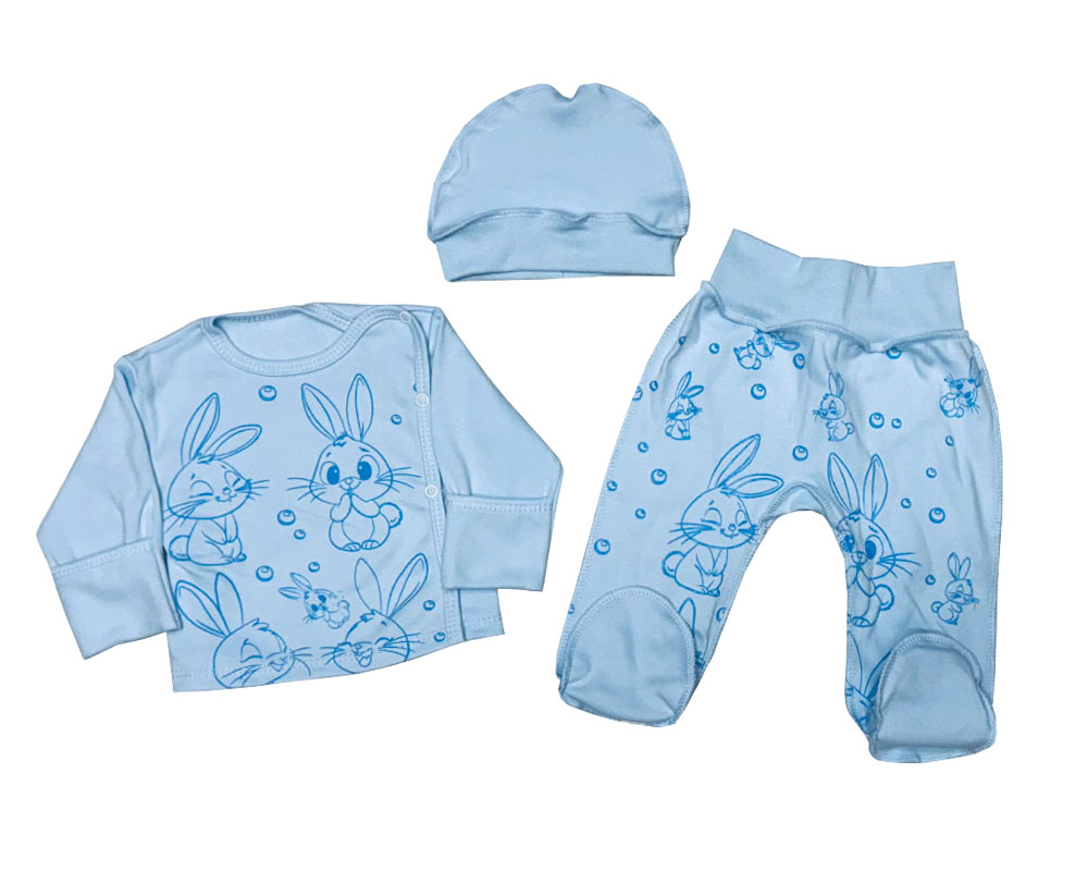 Комплект ясельний 3-х придметний пошитоз натурального трикотажного полотна – інтерлок. Інтерлок тканина гладка з двох сторін і має дуже тонке плетіння ниток, що надає їй м'якість і комфорт. Набір ясельний складається з сорочечки, повзунків і шапочки. Зрізи ручок распашонки закритого типу, але за бажання їх можна відвернути. Застібкою на сорочці служать кнопки. Верхній зріз повзунів оброблений стрейчевим матеріалом, що замінює гумку. Весь комплект виготовлений назовні швами. Рекомендуємо прати виріб при температурі 40 градусів, дає невелику усадку 1-2 см