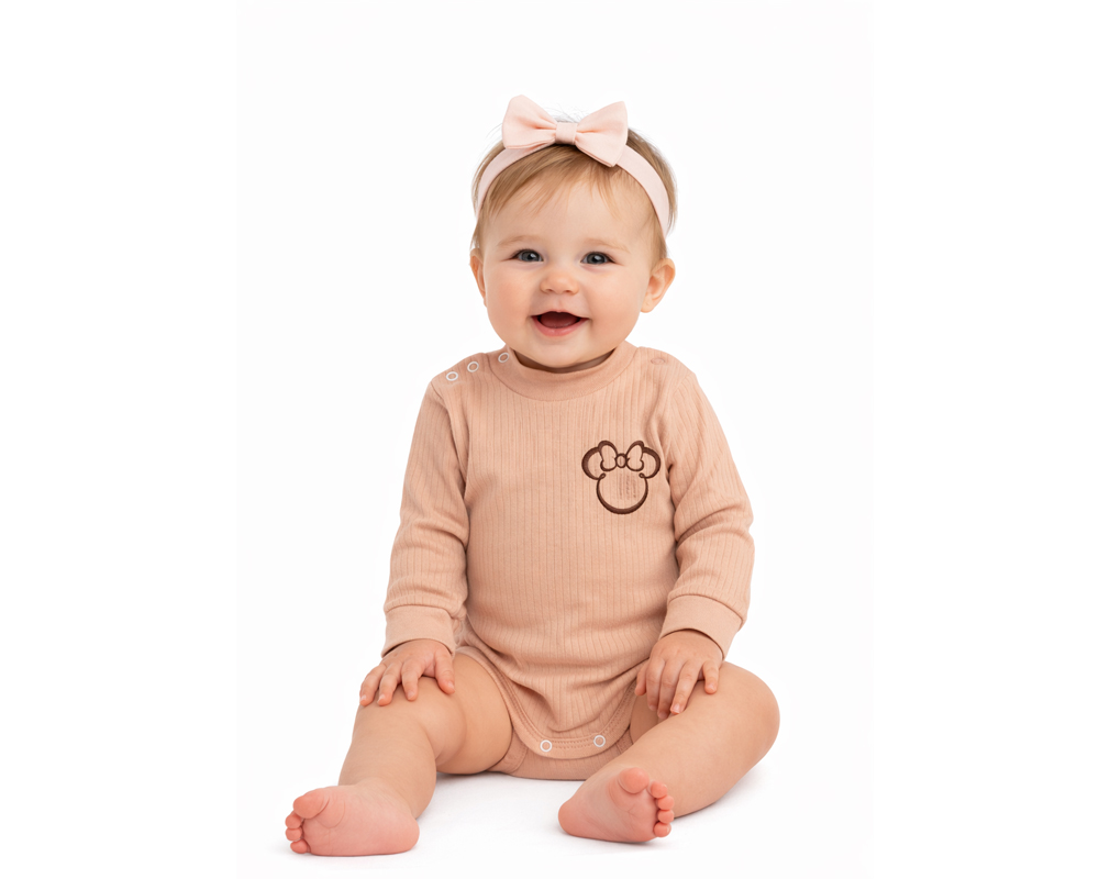 Ніжне бавовняне боді для немовлят у пудровому кольорі з милим принтом. М’яка еластична тканина забезпечує комфорт протягом усього дня. Застібки-кнопки на плечі та між ніжками полегшують перевдягання та заміну підгузка. Ідеальний варіант для щоденного носіння або фотосесії. Вироб продається без банта.