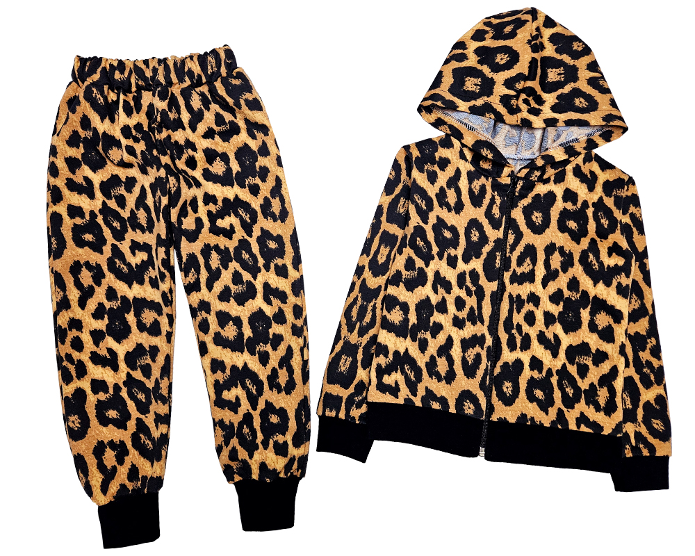 Універсальний спортивний костюм дитячий в яскравому кольорі з принтом "леопард". Кофта на молнії з капюшоном, зручні штани з еластичними манжетами зі стрейча забезпечують оптимальну посадку і свободу руху, Виготовлений з високоякісної тканини турецького виробництва з вмістом 95% хлопка.